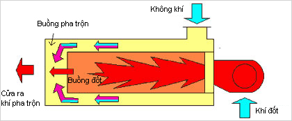 Đốt cháy hoàn toàn nhiên liệu trong buồng đốt, khí đốt nhiệt độ cao được dẫn vào buồng pha trộn.Không khí chảy qua khe hở trong và ngoài ống, được làm lạnh trong ống, đi qua phần ống Venturi , và được pha trộn với khí đốt trong buồng pha trộn và đạt được nhiệt độ cố định. Dựa vào nhiệt độ đầu ra của khí pha trộn để chọn vật liệu chịu lửa phủ lên thiết bị.